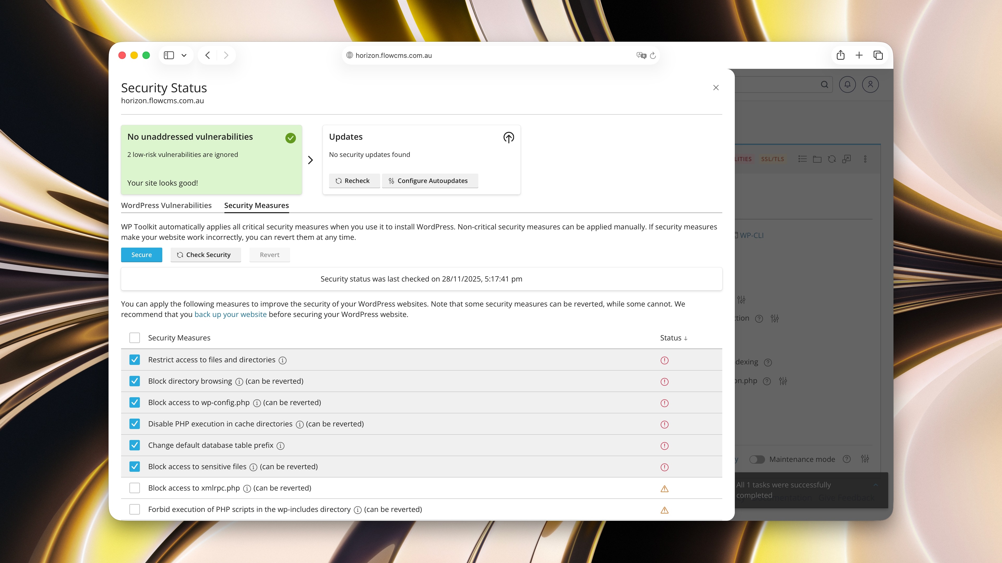 Forget the anxiety of updates. Our experts meticulously test and apply all necessary WordPress core, theme, and plugin updates for you. Combined with automated backups, your site is always up to date and safe to restore.